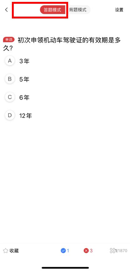 3、進(jìn)入答題頁(yè)面,確保處于答題模式,通過(guò)持續(xù)答題來(lái)積累刷取科目一學(xué)時(shí)。