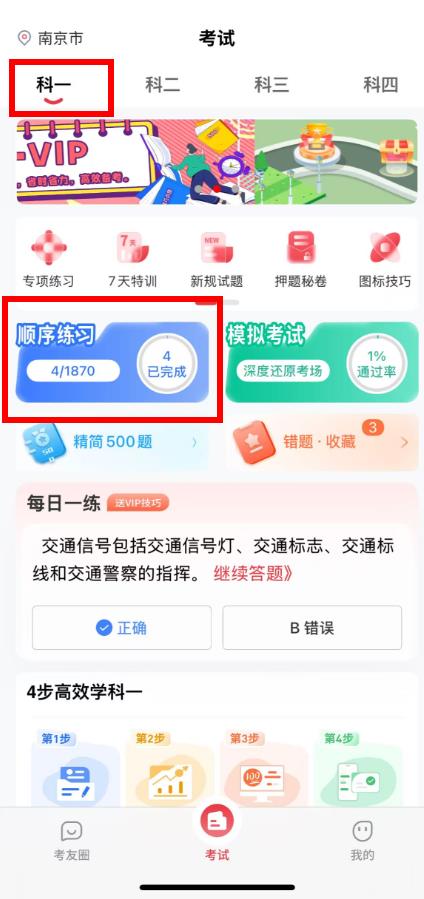 1、打開(kāi)多多駕到APP,點(diǎn)擊底部考試按鈕進(jìn)入考試界面,選擇科一,然后點(diǎn)擊順序練習(xí)。