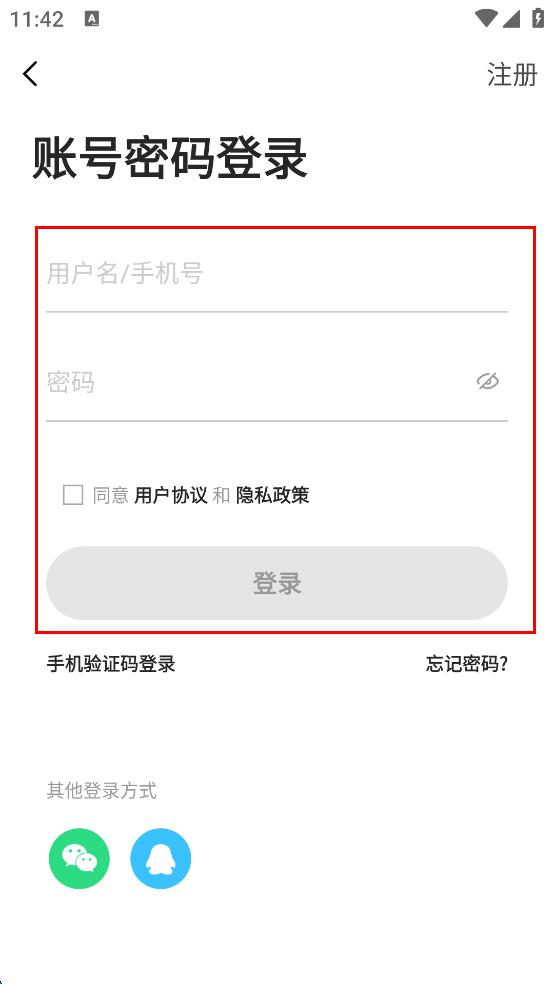 4、在賬號密碼登錄界面,輸入用戶名或手機(jī)號、密碼,勾選“同意用戶協(xié)議和隱私政策”,點(diǎn)擊“登錄”按鈕。