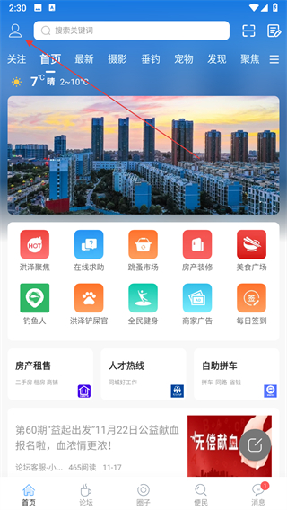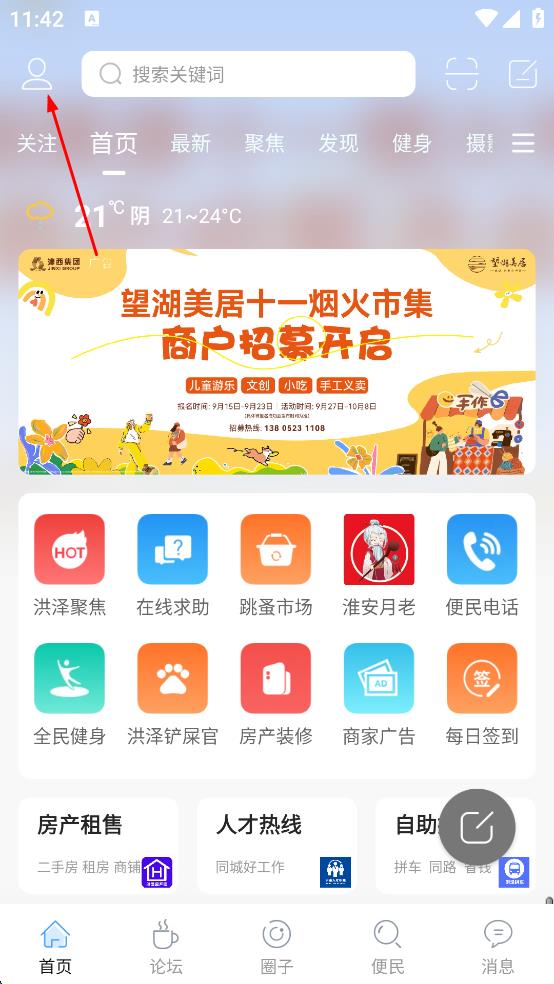 1、打開洪澤論壇APP,點(diǎn)擊左上角的個(gè)人圖標(biāo)。