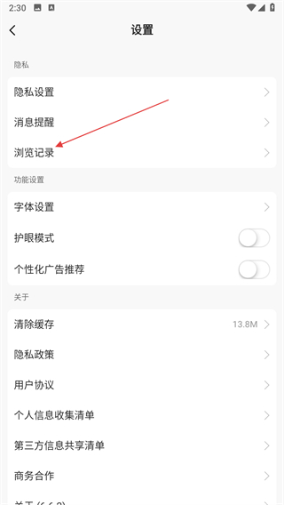 3、在設(shè)置頁面點(diǎn)擊瀏覽記錄選項(xiàng),進(jìn)入瀏覽記錄頁面。