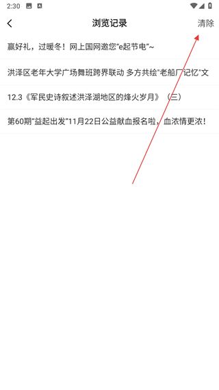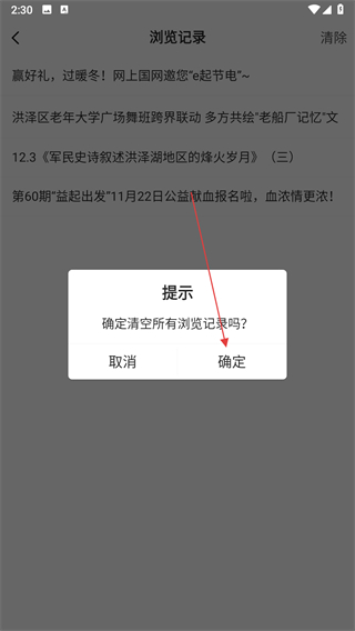 4、在瀏覽記錄頁面點(diǎn)擊右上角清除按鈕,彈出提示框。