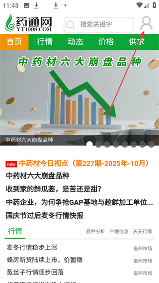 1、打開藥通網(wǎng)APP,進(jìn)入首頁,點(diǎn)擊右上角的人像圖標(biāo),進(jìn)入賬號(hào)登錄頁面。