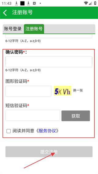 4、確認(rèn)密碼,輸入圖形驗(yàn)證碼、短信驗(yàn)證碼,勾選閱讀并同意服務(wù)協(xié)議,點(diǎn)擊提交注冊(cè)。