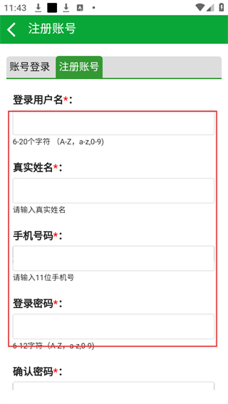 3、在注冊(cè)賬號(hào)頁面,依次填寫登錄用戶名、真實(shí)姓名、手機(jī)號(hào)碼、登錄密碼。