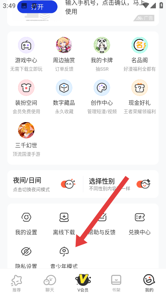 1、打開騰訊動漫APP,點擊右下角我的,進入個人頁面后找到青少年模式并點擊。
