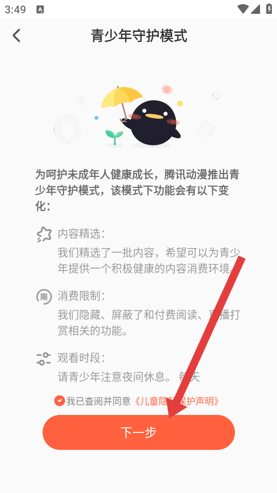 2、進入青少年守護模式的頁面,勾選我已查閱并同意兒童隱私保護聲明,然后點擊下一步。
