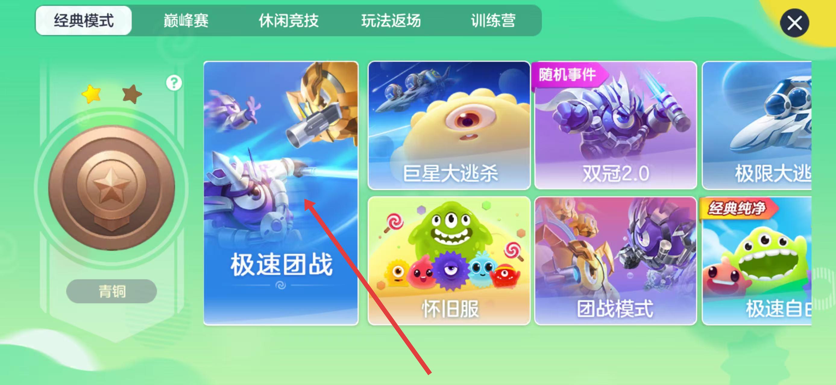 1、進(jìn)入游戲后,在模式選擇界面點(diǎn)擊經(jīng)典模式下的極速團(tuán)戰(zhàn)選項(xiàng),準(zhǔn)備開(kāi)啟團(tuán)戰(zhàn)玩法,感受激烈對(duì)抗的樂(lè)趣。