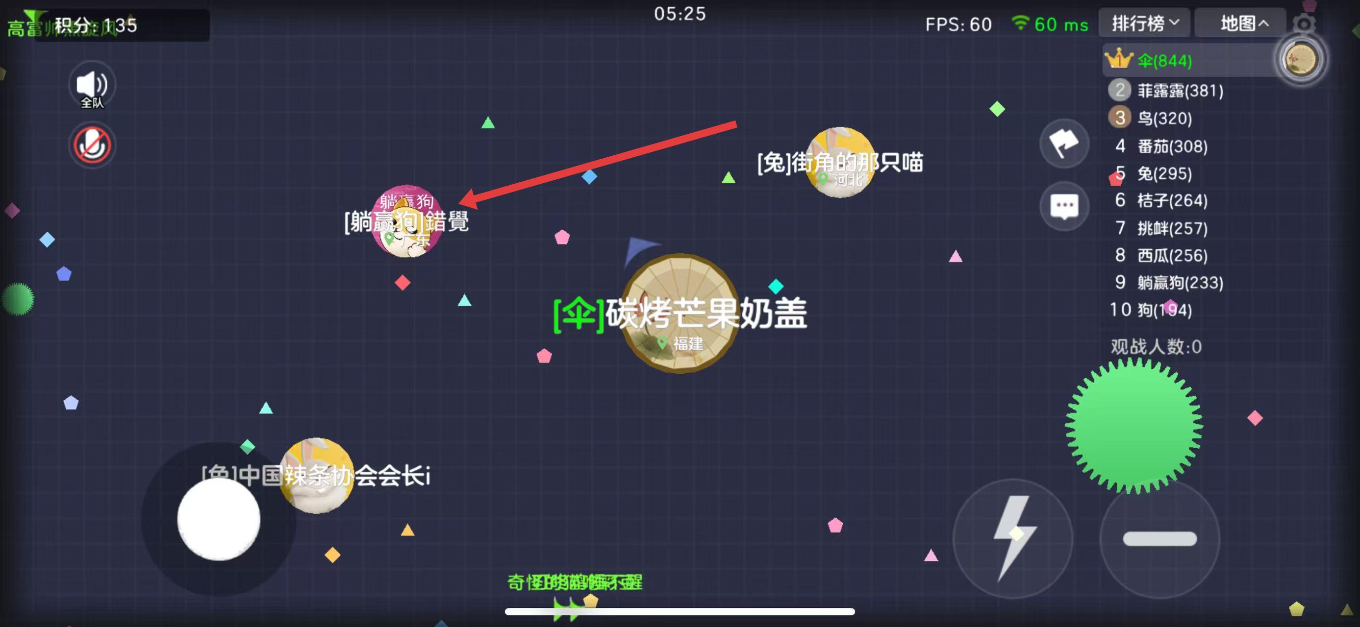 3、進(jìn)入游戲?qū)趾?,通過(guò)移動(dòng)搖桿操控球球,吞噬地圖上的彩色小方塊積累體積。同時(shí)觀察排行榜,留意其他玩家的情況,找準(zhǔn)時(shí)機(jī)吞噬比自己小的球球,壯大自身。