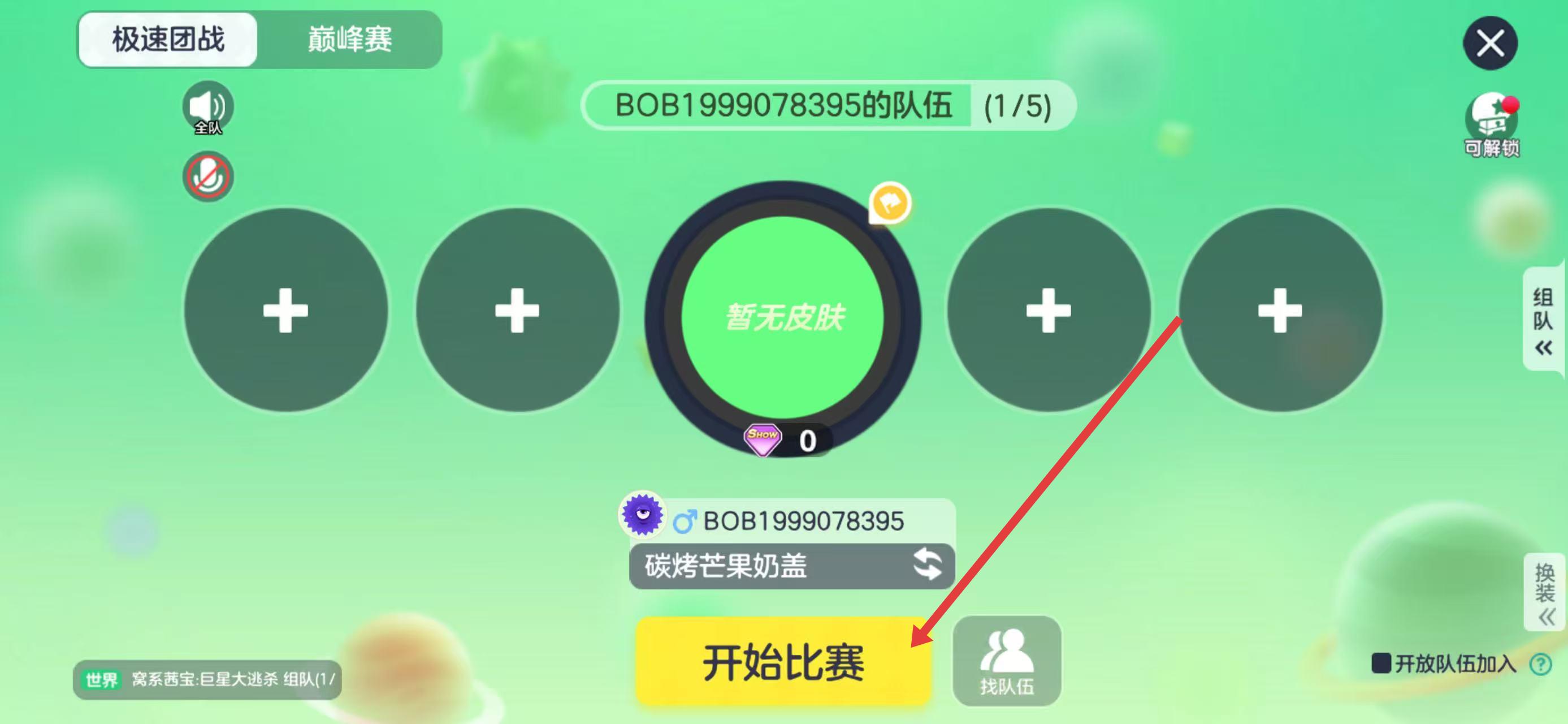 2、在極速團(tuán)戰(zhàn)組隊(duì)界面,可點(diǎn)擊加號(hào)邀請(qǐng)好友組隊(duì),湊齊最多5人隊(duì)伍。若不組隊(duì),確認(rèn)好昵稱(chēng)等信息后,直接點(diǎn)擊開(kāi)始比賽,快速匹配對(duì)手進(jìn)入對(duì)局。