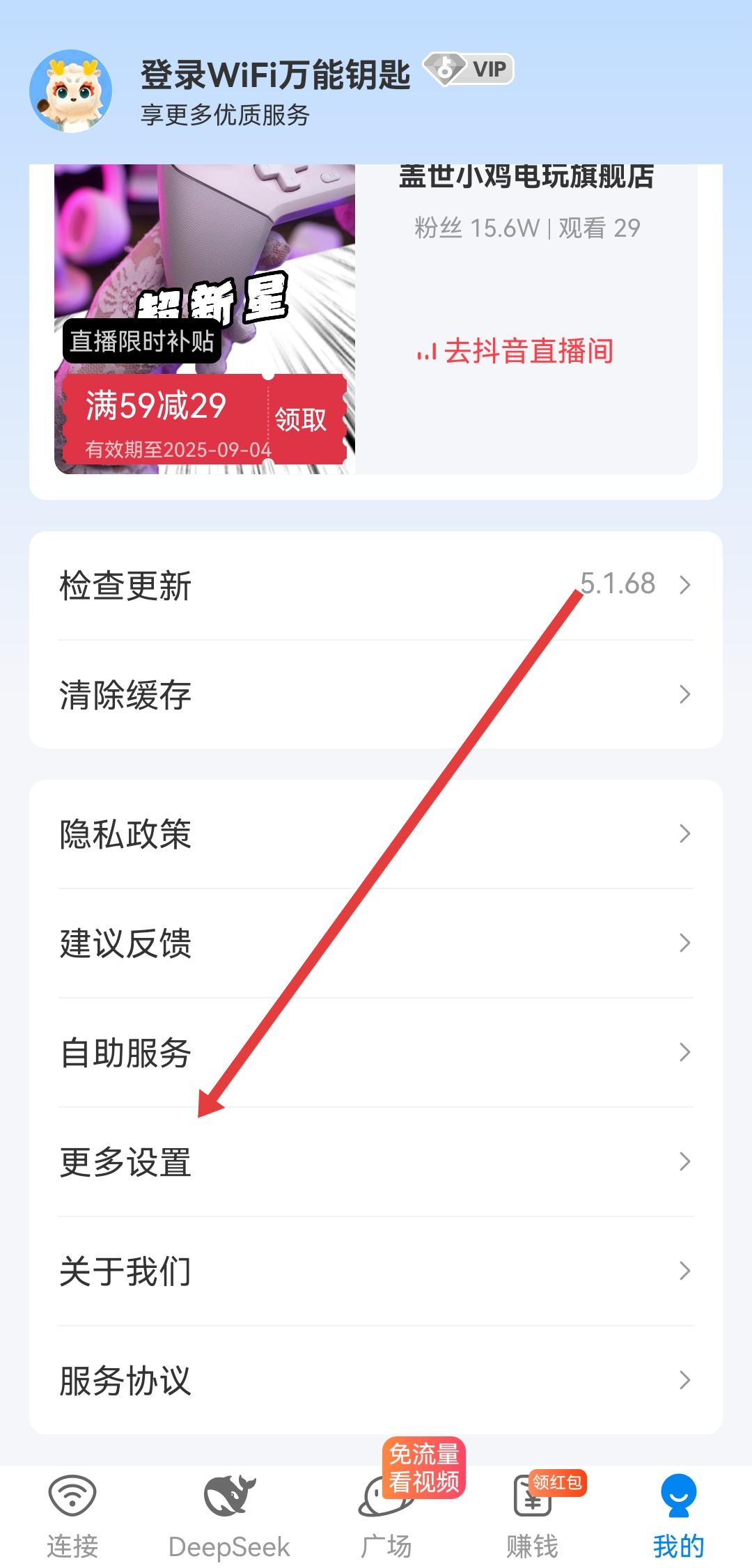 1、打開WiFi萬能鑰匙,進入我的頁面,找到并點擊更多設置,進入更多設置的界面。