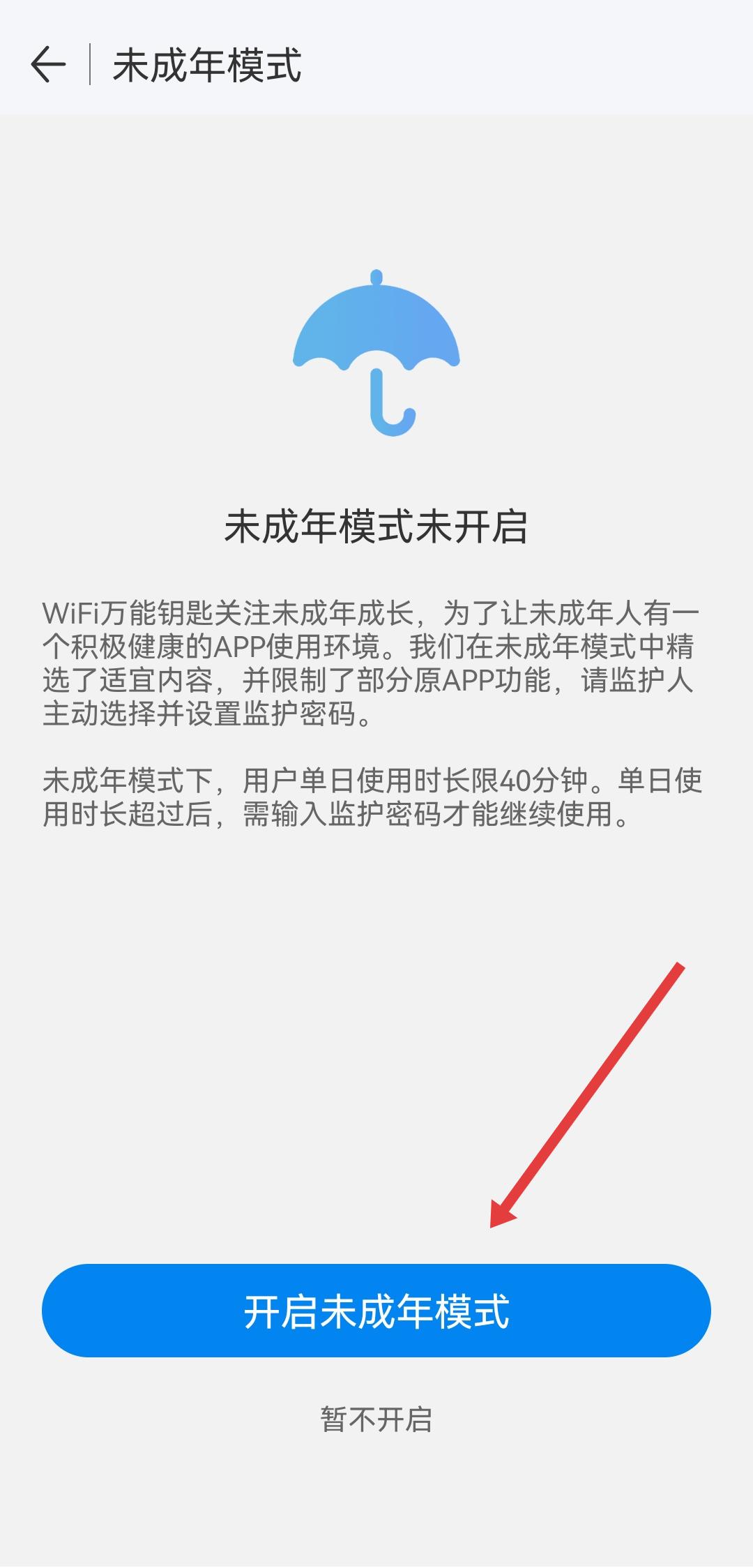 3、在未成年模式頁面里,點擊開啟未成年模式按鈕,即可開啟該模式,為未成年人營造健康的使用環(huán)境。