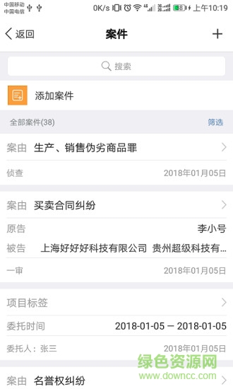 6.“案件”,可以新增案件,所有案件都在“案件”中能查看到,可以在此點(diǎn)搜索,并能查看詳細(xì)的案件信息。案件詳細(xì)信息中可以添加開庭,添加備注。 在案件中往下拖動窗口將數(shù)據(jù)保存到云服務(wù)器,以防丟失。