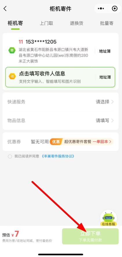 3、在柜機寄件頁面,填寫收件人信息、選擇快遞服務、填寫物品信息確認信息無誤后,點擊立即下單。