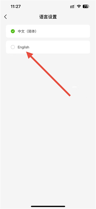 4、在語言設置界面,選擇English對應的單選按鈕,即可將app切換為英文模式。
