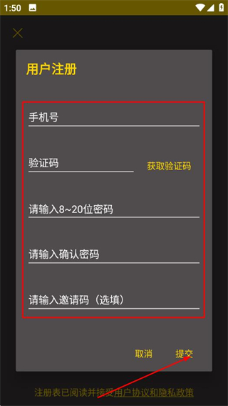 4、輸入手機號、獲取并輸入驗證碼,設(shè)置密碼并再次確認密碼,選填邀請碼,點擊提交。