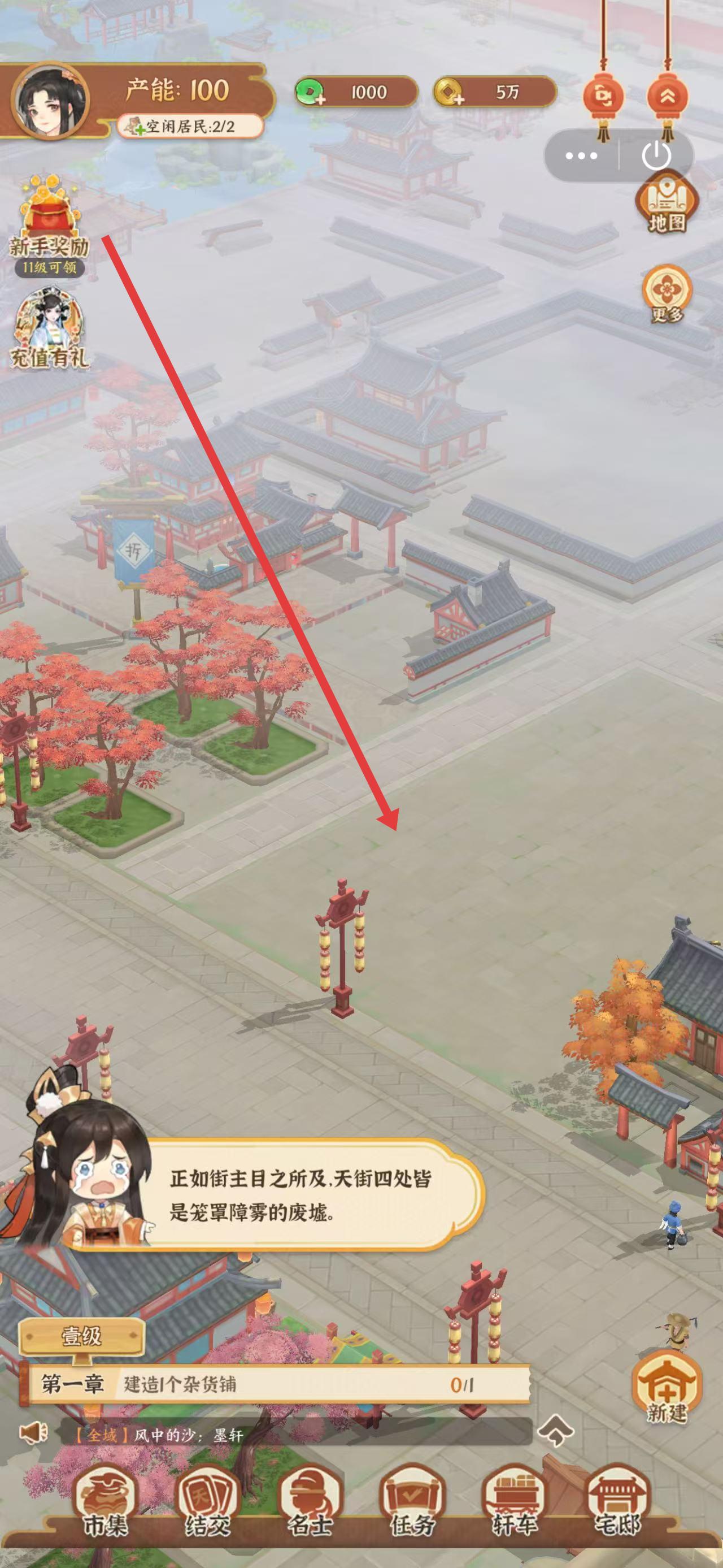 3、游戲加載完成進(jìn)入界面后,依據(jù)游戲內(nèi)指引操作,像按提示建造1個(gè)雜貨鋪,逐步熟悉玩法開(kāi)啟游戲體驗(yàn)。
