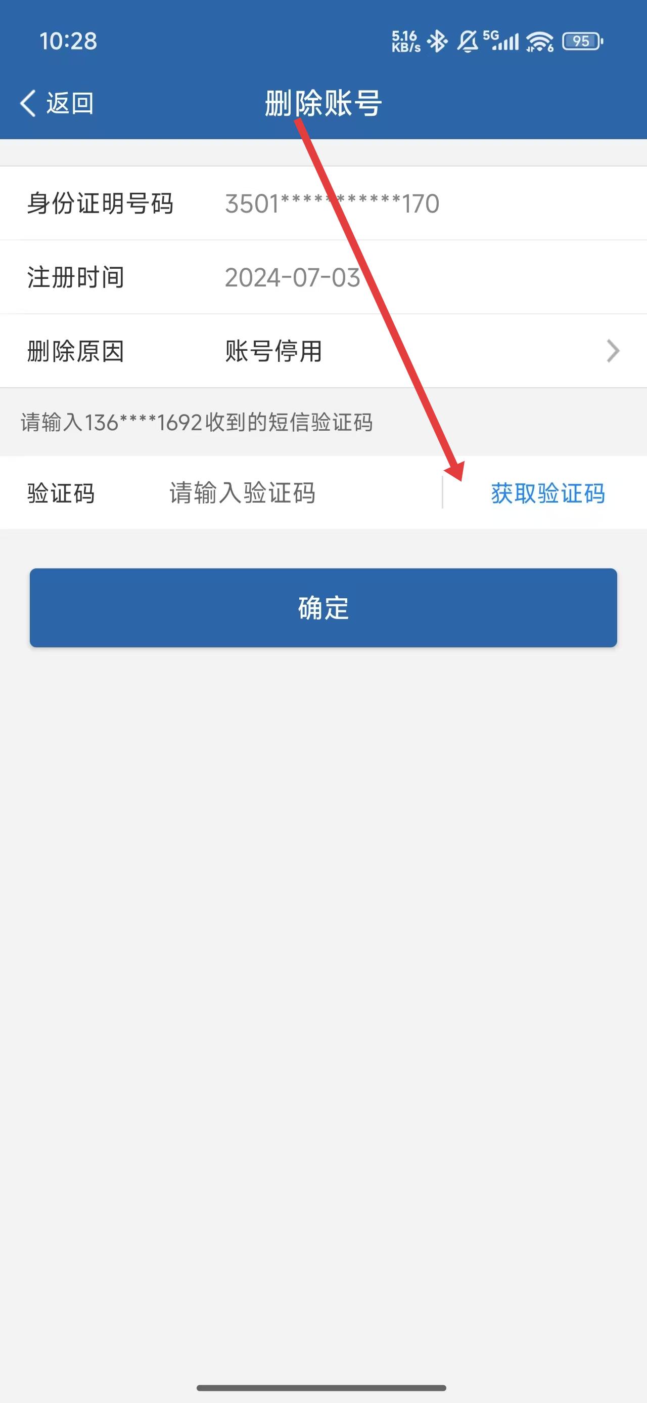 4、點(diǎn)擊獲取驗(yàn)證碼按鈕,在填寫完驗(yàn)證碼后完成刪除操作。