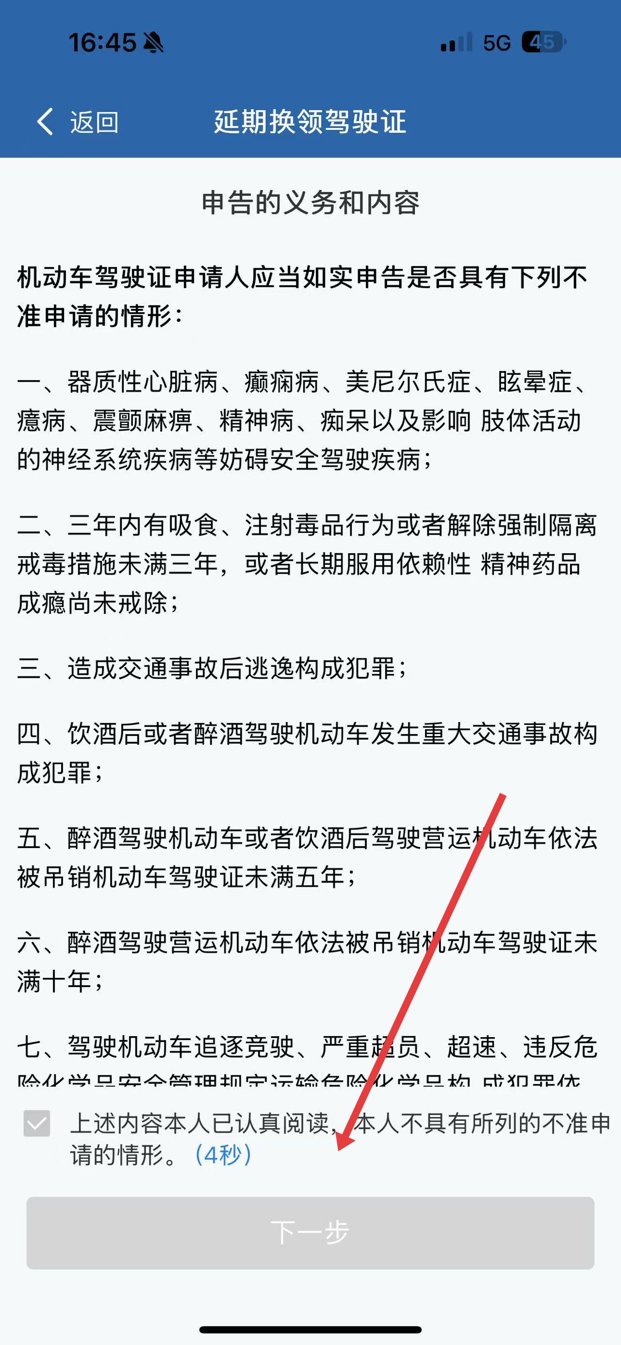2、在延期換領(lǐng)駕駛證頁(yè)面,仔細(xì)閱讀申告的義務(wù)和內(nèi)容,勾選確認(rèn)無(wú)不準(zhǔn)申請(qǐng)情形后,點(diǎn)擊下一步。