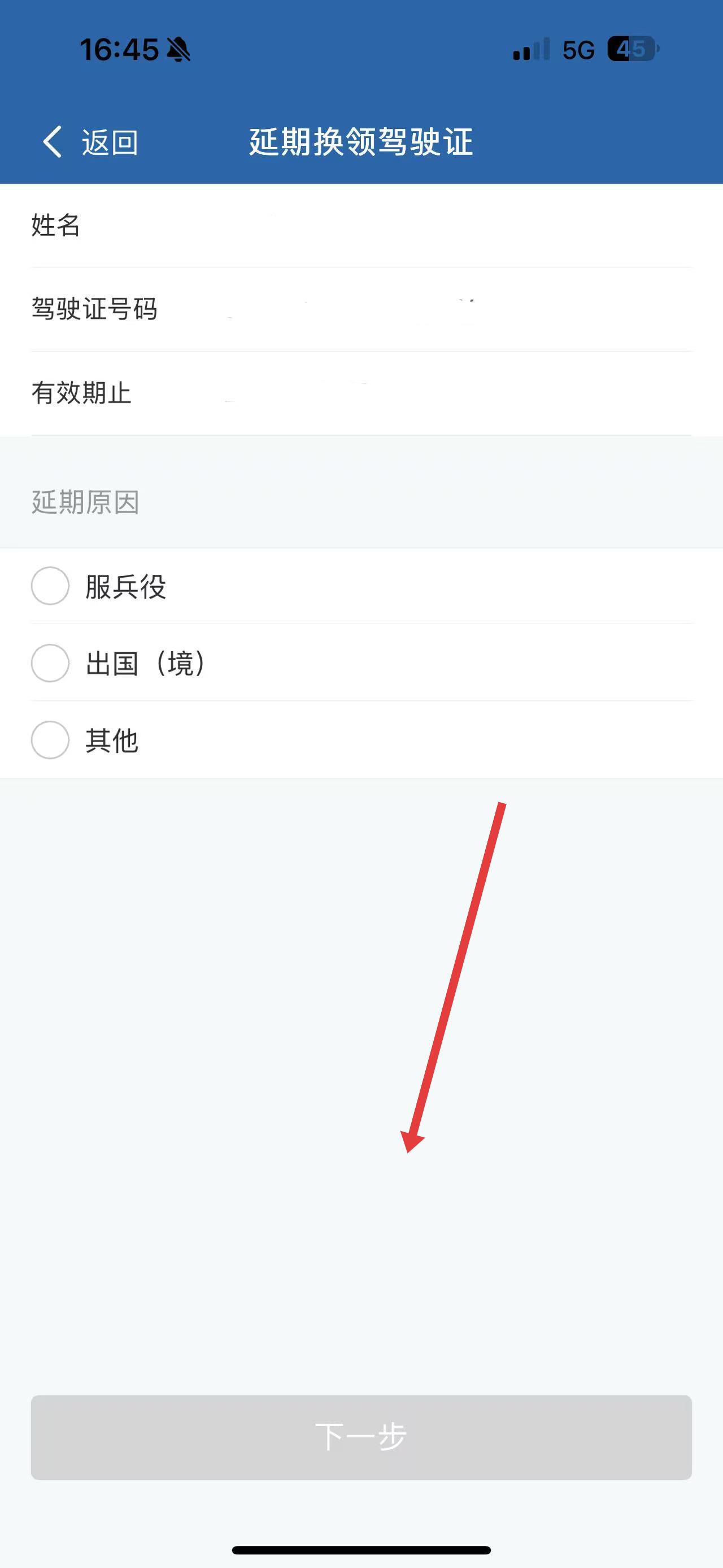 3、進(jìn)入信息填寫(xiě)頁(yè)面,確認(rèn)姓名、駕駛證號(hào)碼等信息,選擇延期原因后,再次點(diǎn)擊下一步,按后續(xù)提示完成延期換證申請(qǐng)。
