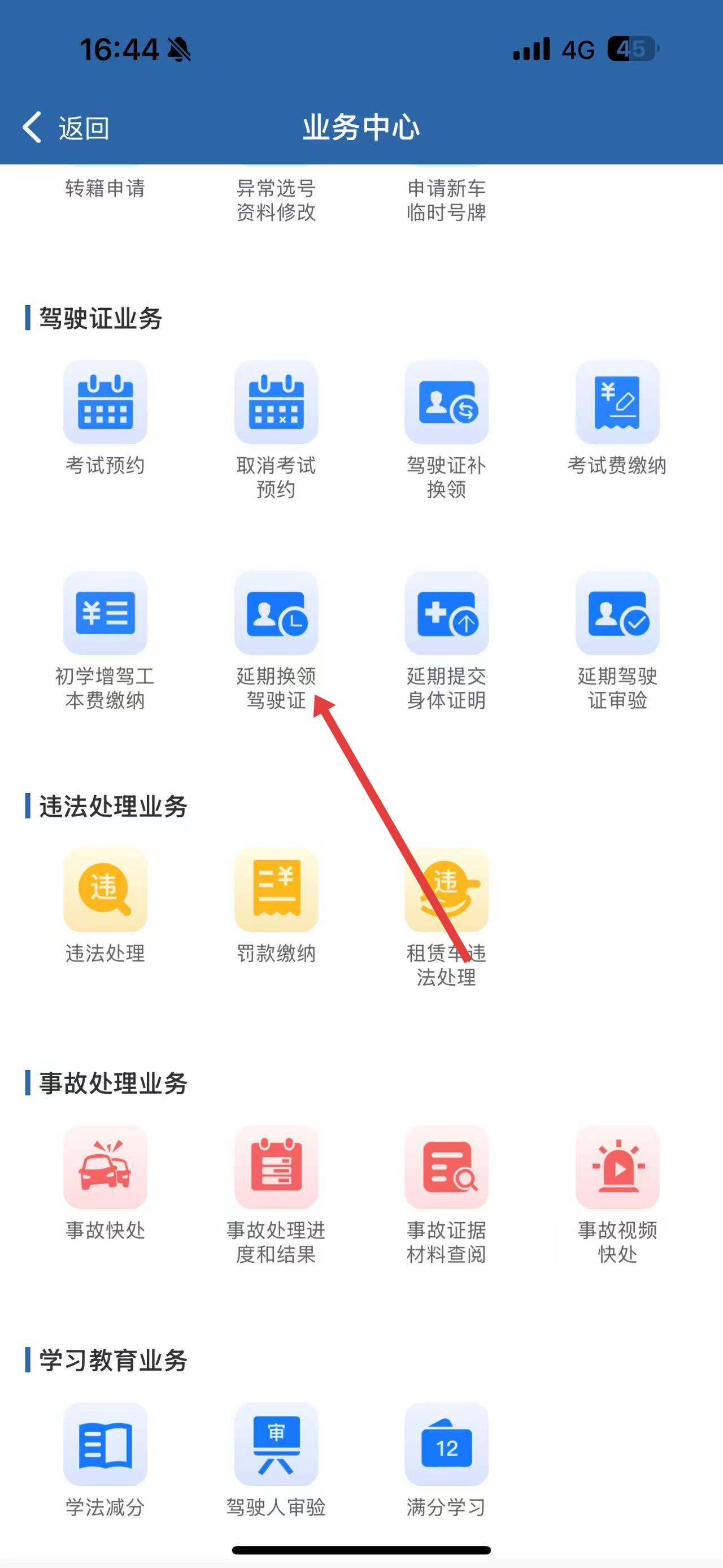 1、打開(kāi)交管12123APP,進(jìn)入業(yè)務(wù)中心,點(diǎn)擊延期換領(lǐng)駕駛證選項(xiàng)。
