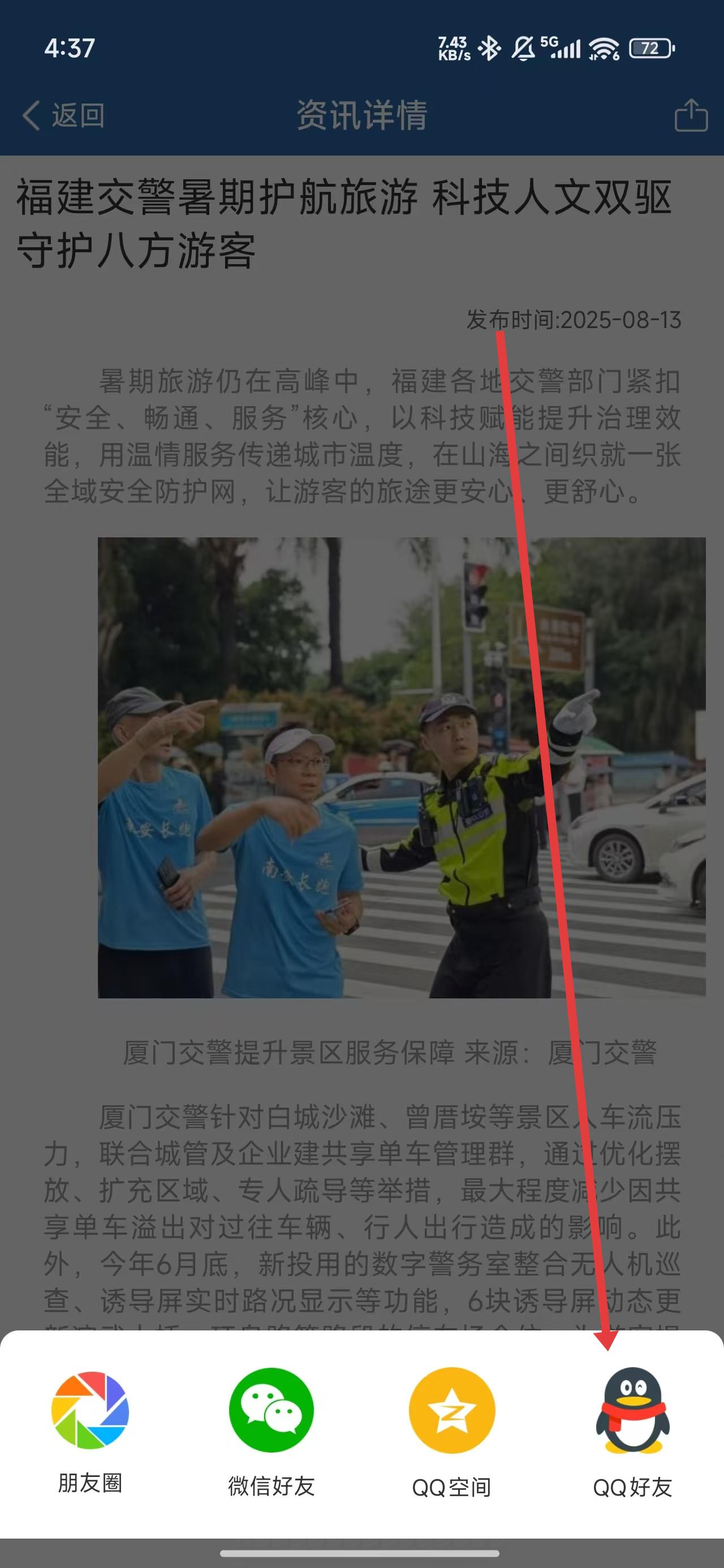 4、可以通過點(diǎn)擊QQ圖標(biāo),上傳給QQ好友查看這條最新資訊。