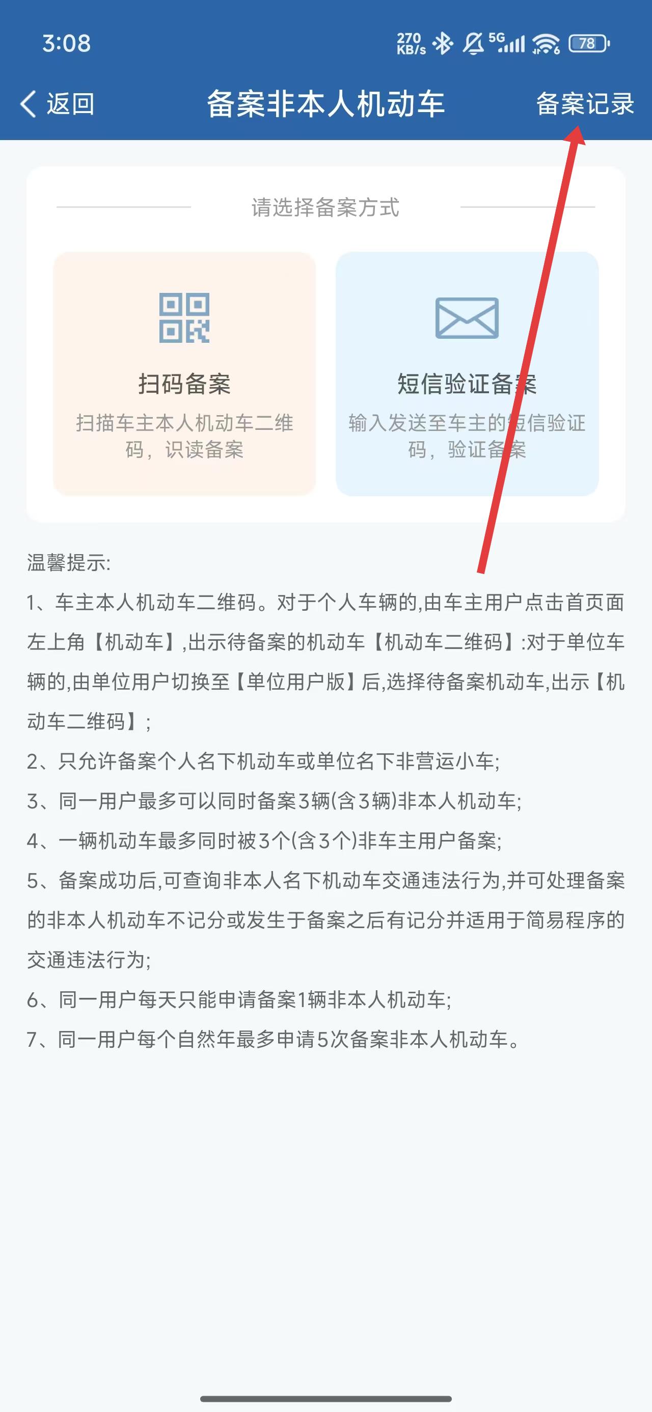 3、在進(jìn)入到備案非本人機(jī)動(dòng)車(chē)頁(yè)面中,可以點(diǎn)擊右上角備案記錄查看備案信息。