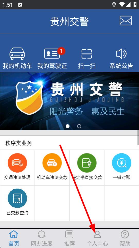 1、打開(kāi)貴州交警app,進(jìn)入首頁(yè)后點(diǎn)擊底部導(dǎo)航欄的個(gè)人中心選項(xiàng)。