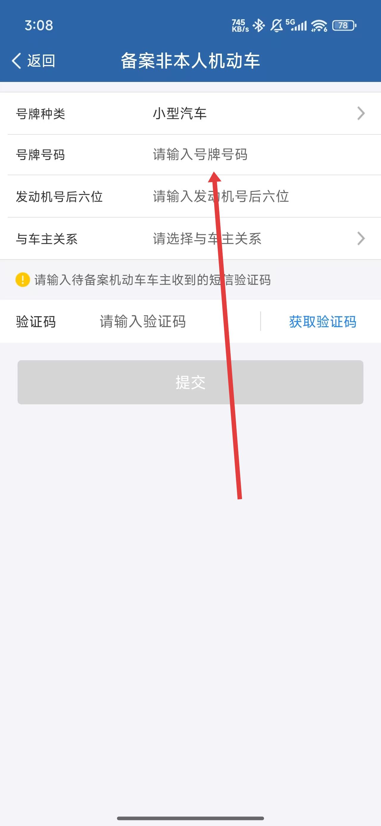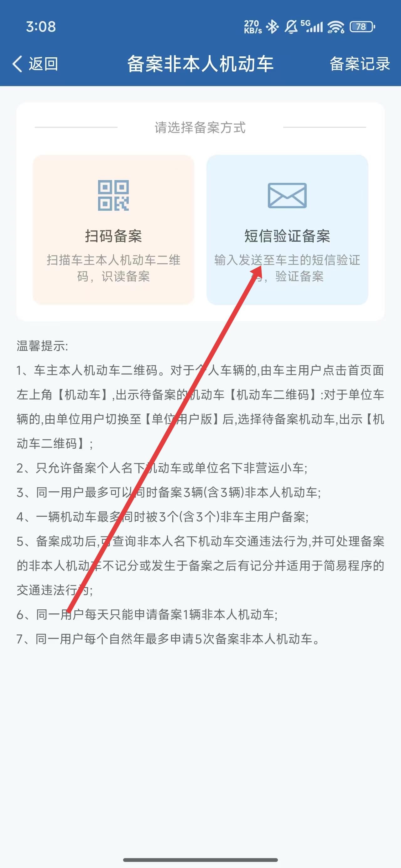 3、在進(jìn)入到備案非本人機(jī)動車頁面中,可以點(diǎn)擊選擇短信驗(yàn)證備案的方式辦理。