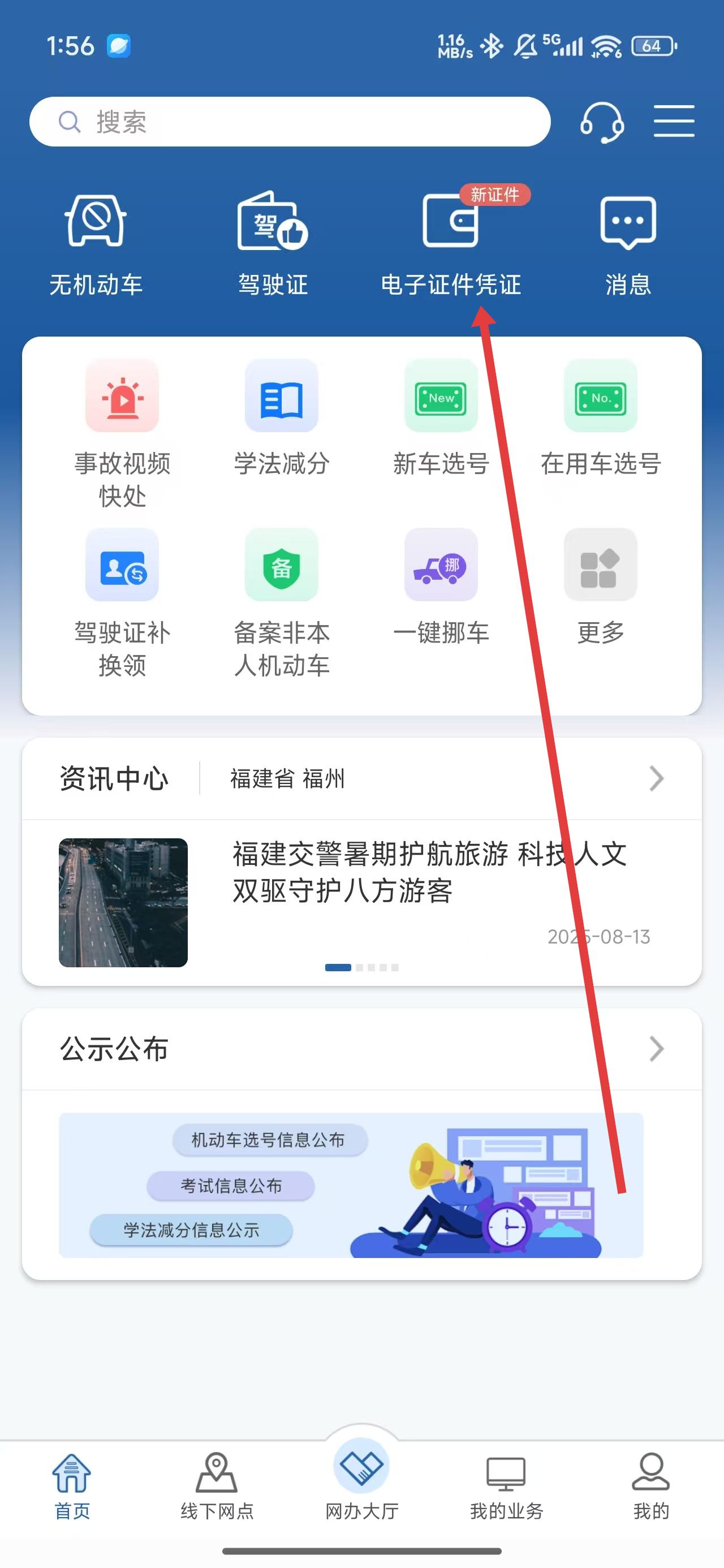 1、點(diǎn)擊主頁面中的電子證件憑證按鈕,進(jìn)入查看相關(guān)服務(wù)信息。