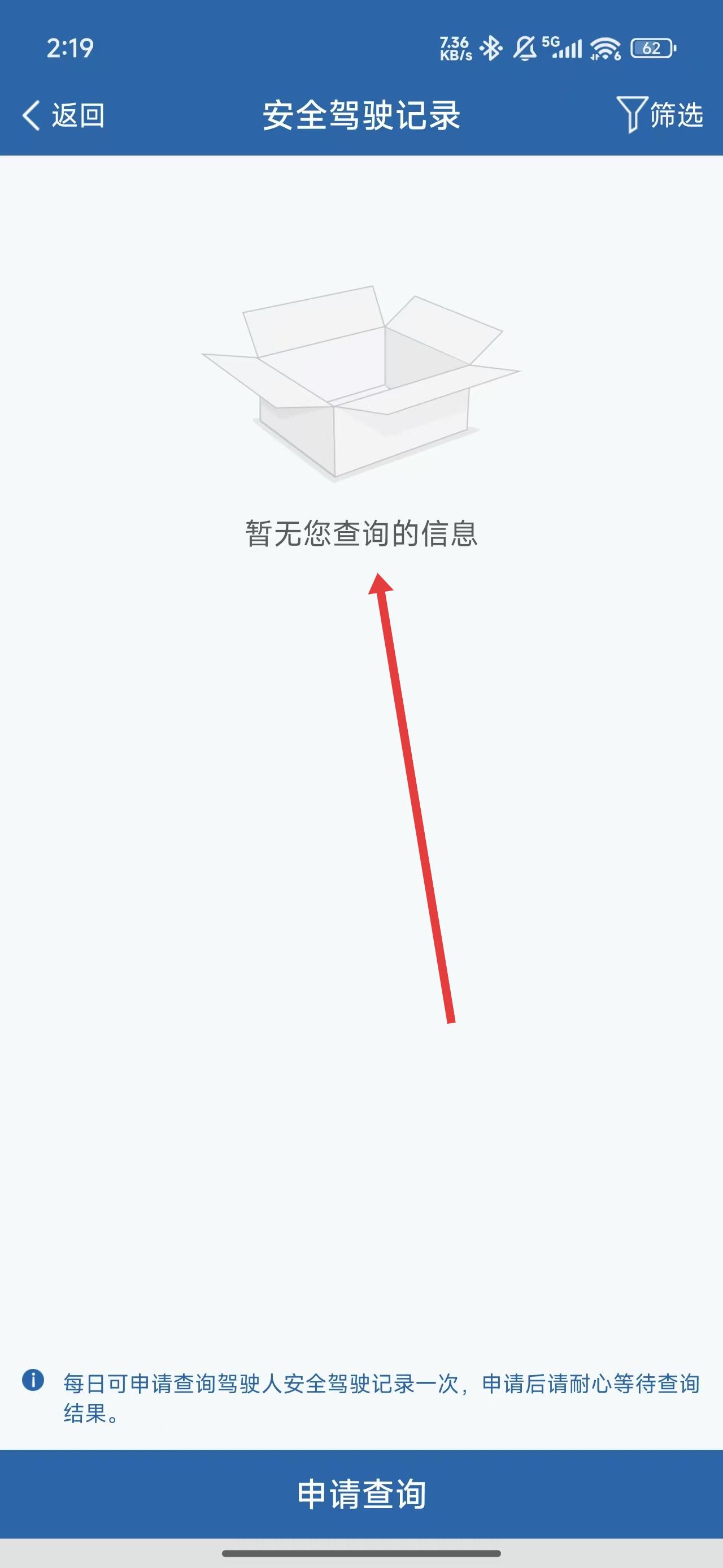 3、在安全駕駛記錄頁面中,可以觀察到當(dāng)前暫無查詢的安全駕駛記錄信息。