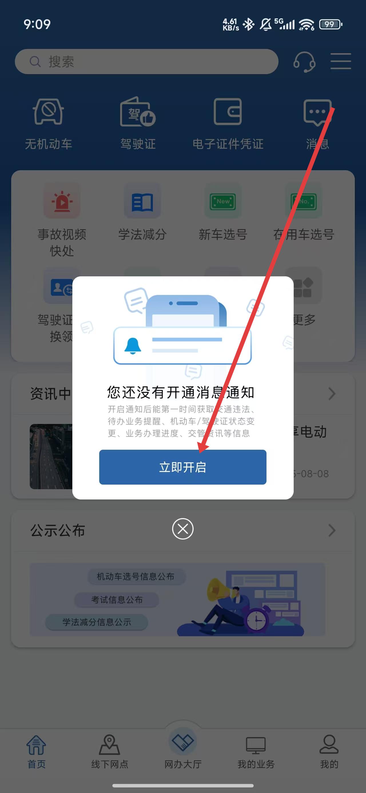 3、在進(jìn)入到交管12123APP內(nèi)時,可點擊彈窗中的立即開啟按鈕,開啟消息通知。