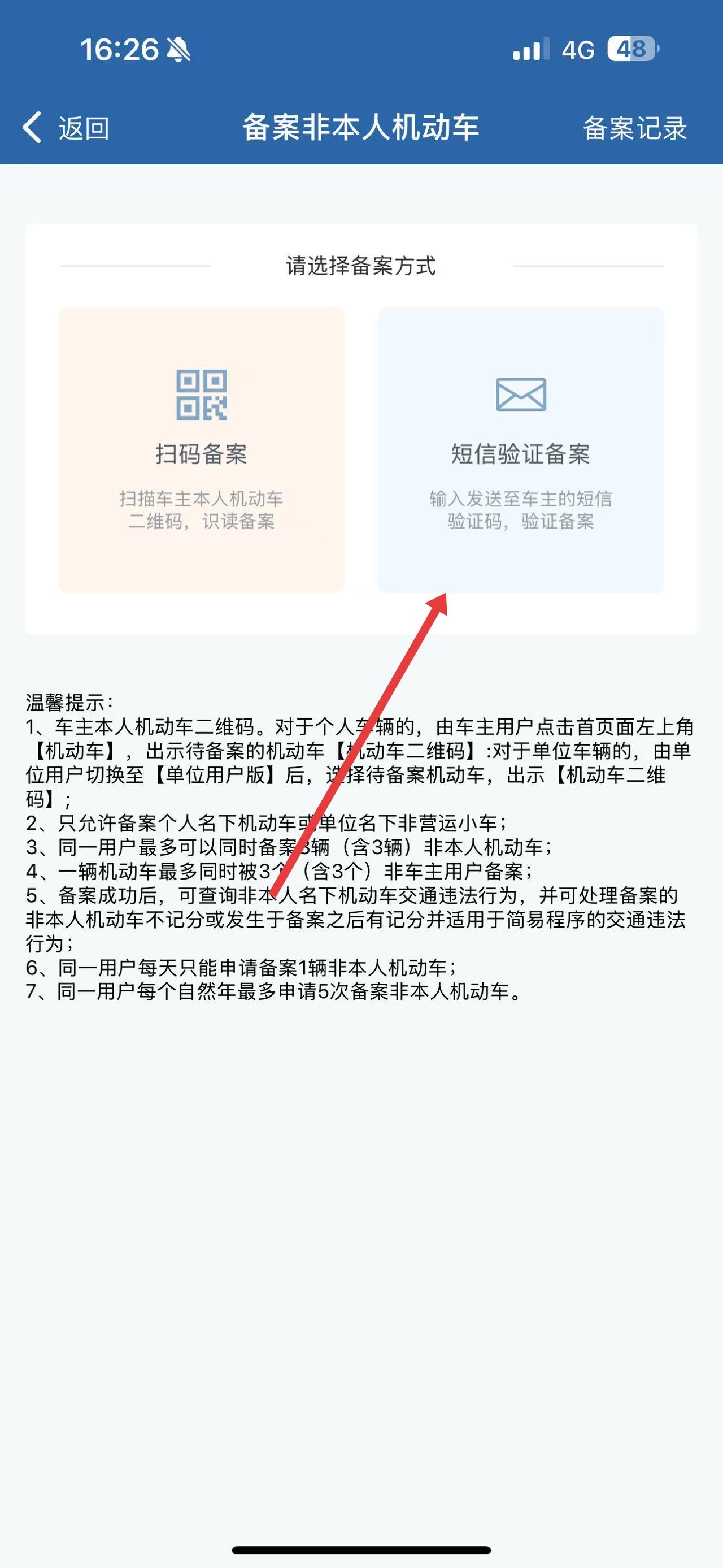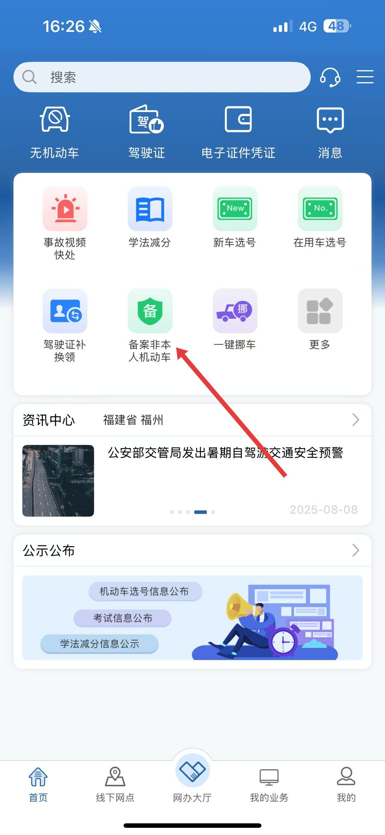 1、打開(kāi)交管12123應(yīng)用進(jìn)入首頁(yè),點(diǎn)擊備案非本人機(jī)動(dòng)車(chē)選項(xiàng)準(zhǔn)備備案。