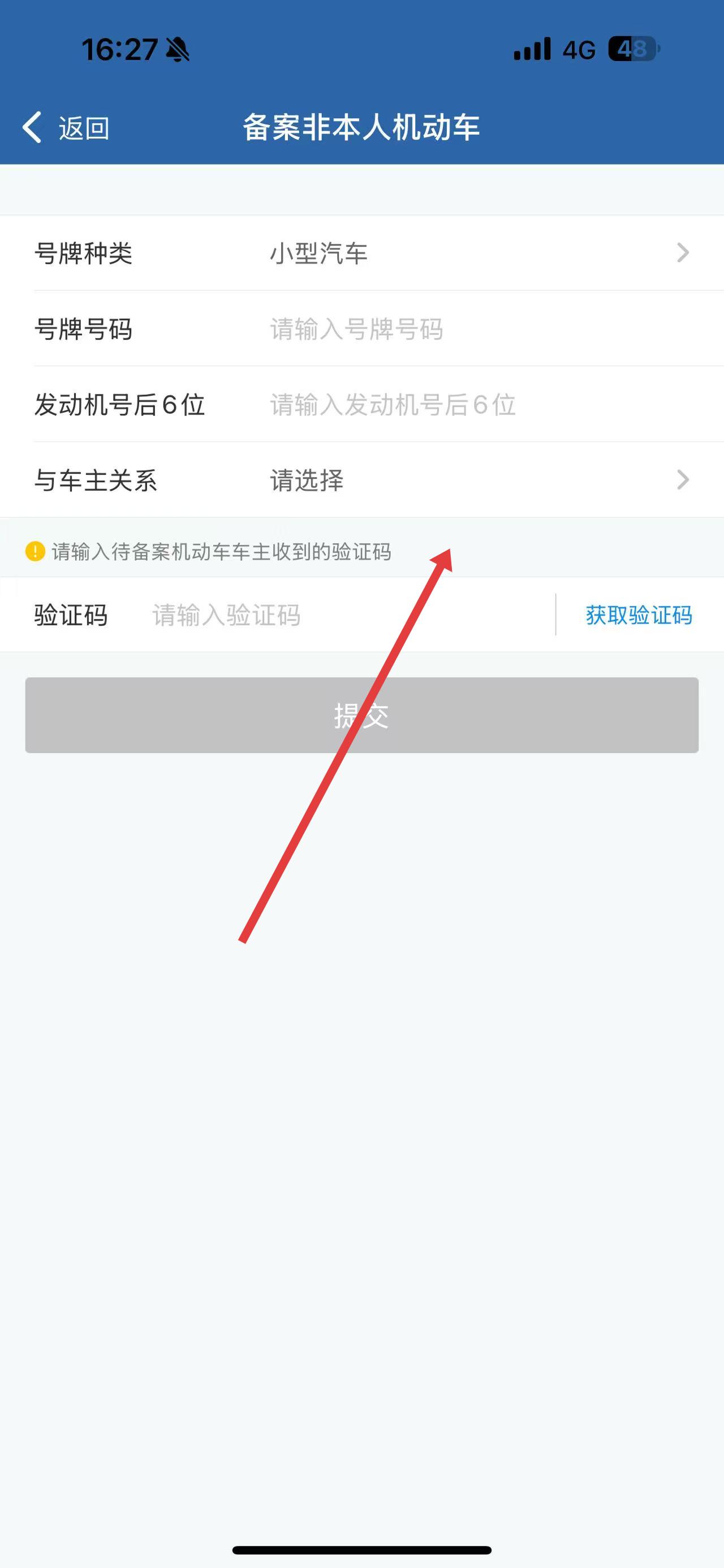 3、進(jìn)入備案信息填寫(xiě)頁(yè)面,依次輸入號(hào)牌號(hào)碼、發(fā)動(dòng)機(jī)號(hào)后6位等信息,獲取并填入車(chē)主收到的驗(yàn)證碼后提交。