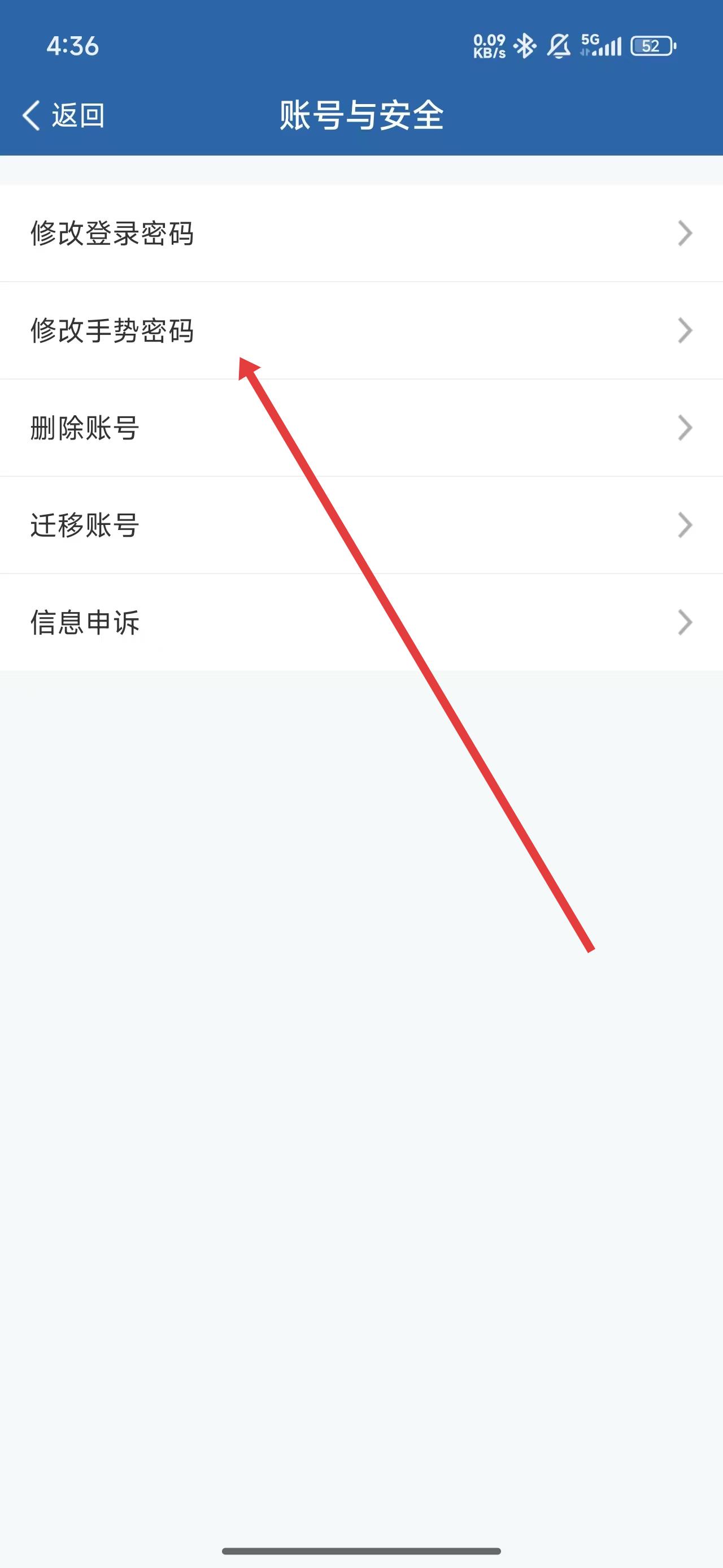 2、在跳轉(zhuǎn)到賬號(hào)與安全頁面中后,點(diǎn)擊修好手勢(shì)密碼選項(xiàng),進(jìn)入修改。