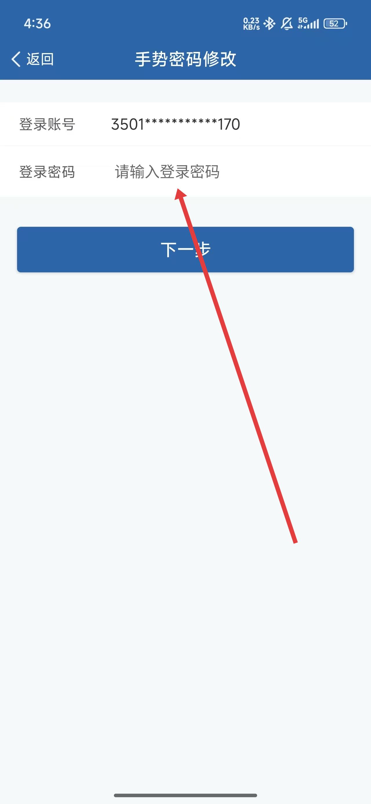3、在手勢(shì)密碼修改頁面中,點(diǎn)擊輸入框填寫登錄密碼后,開始修改操作。