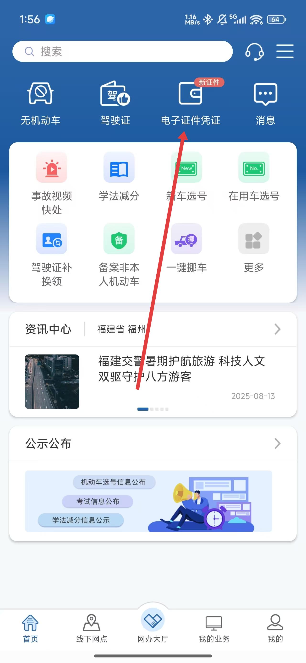 1、在進(jìn)入到應(yīng)用首頁(yè)中后,可以點(diǎn)擊電子證件憑證按鈕,進(jìn)入查看有關(guān)服務(wù)功能。