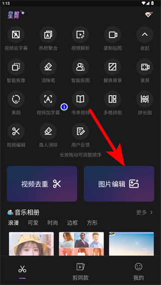 1、打開(kāi)秀拍客APP,點(diǎn)擊圖片編輯功能,進(jìn)入圖片選擇界面。