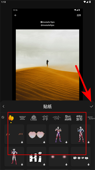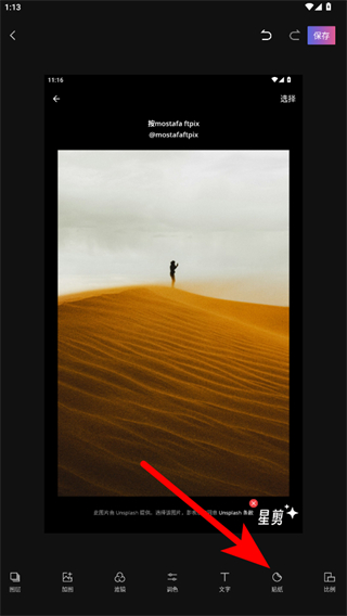 3、在圖片編輯頁(yè)面,點(diǎn)擊底部貼紙選項(xiàng),展開(kāi)貼紙選擇列表。