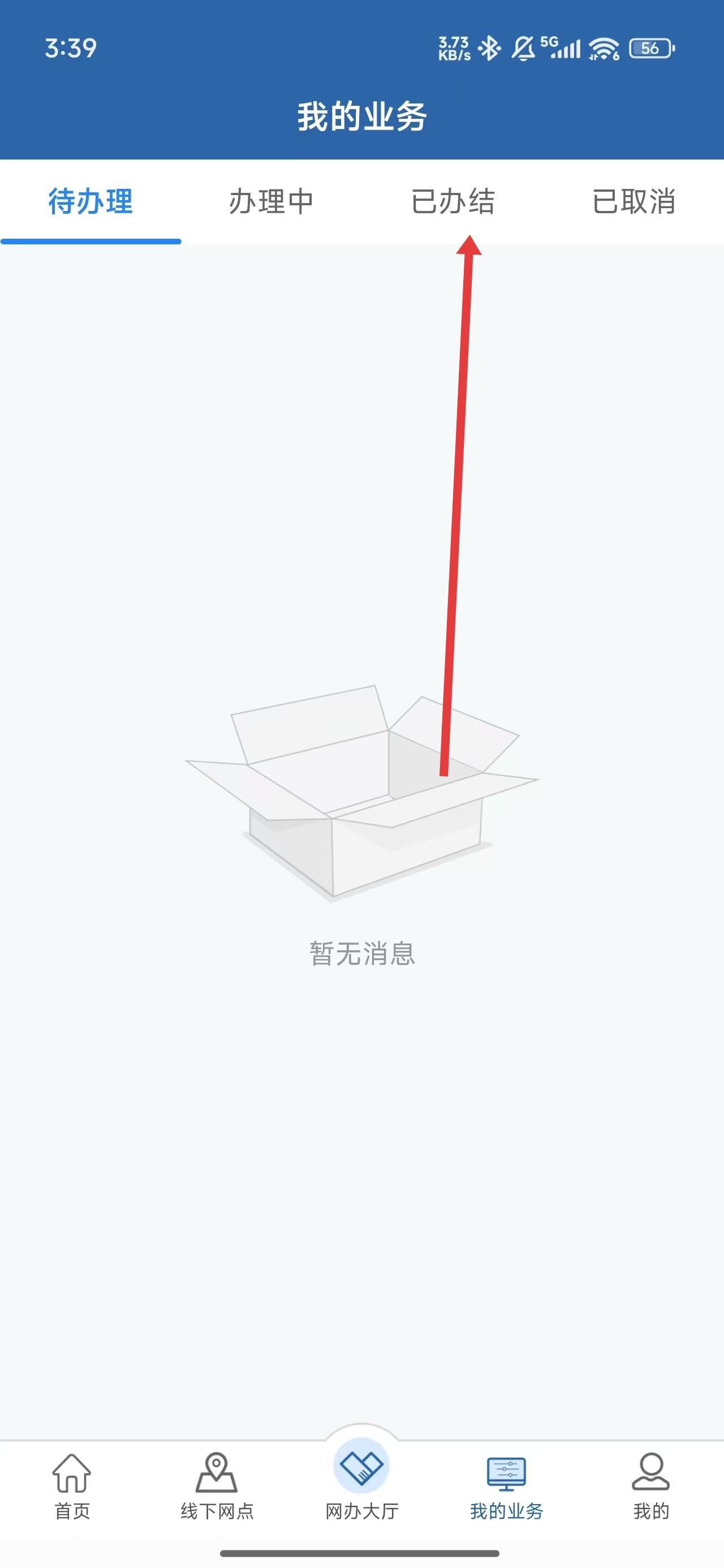 2、在進(jìn)入到我的業(yè)務(wù)頁(yè)面時(shí),可點(diǎn)擊已辦結(jié)選項(xiàng),查看已完成的業(yè)務(wù)信息。