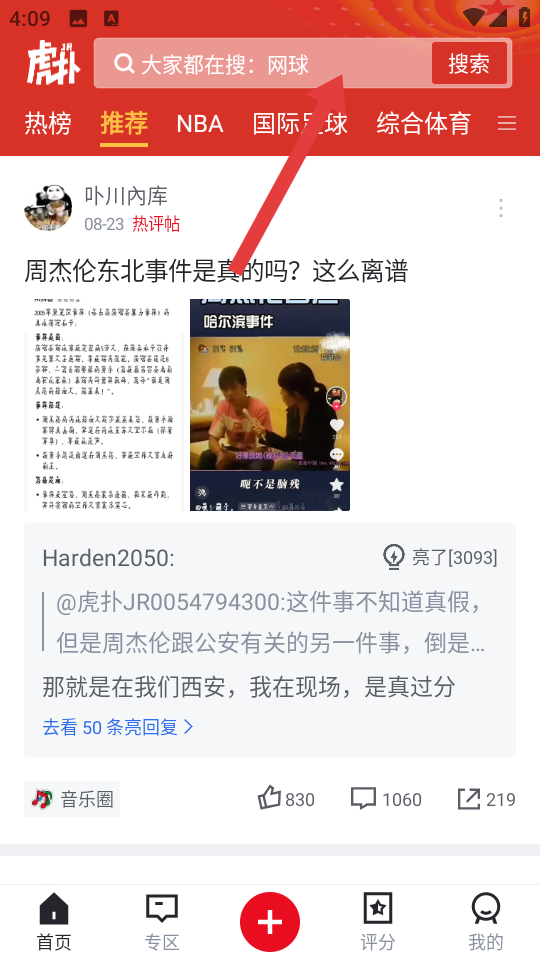 1、打開虎撲APP,在首頁頂部的搜索欄中輸入要關(guān)注的用戶名稱,點(diǎn)擊搜索。