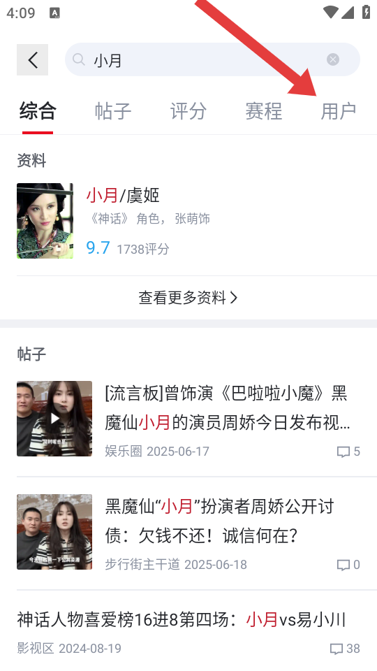 2、在搜索結(jié)果的頁面,點(diǎn)擊用戶的標(biāo)簽,進(jìn)入用戶的搜索結(jié)果列表。