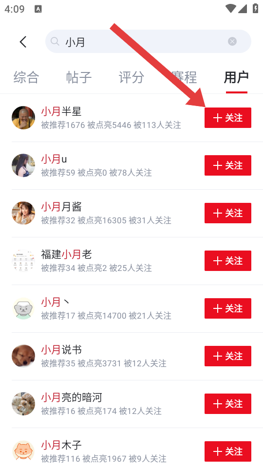 3、在用戶列表里,找到目標(biāo)用戶,點(diǎn)擊其右側(cè)的+關(guān)注按鈕,即可成功關(guān)注該用戶。
