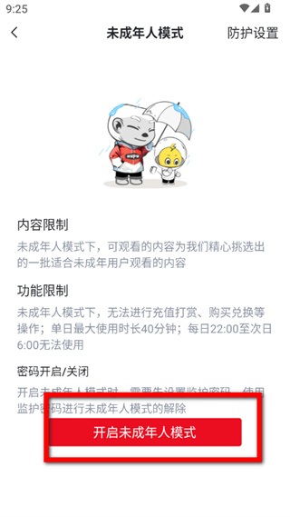 4、在未成年人模式界面,點(diǎn)擊開啟未成年人模式按鈕,即可開啟該模式。