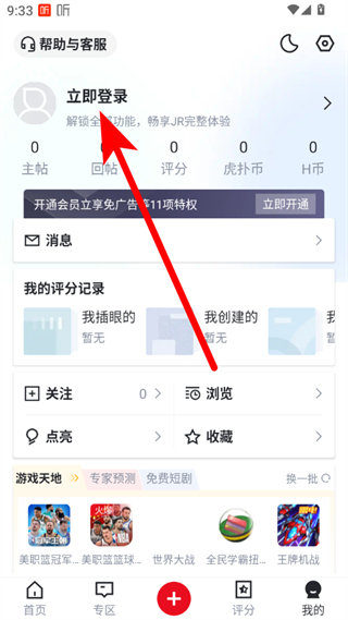 1、在虎撲首頁,點(diǎn)擊右下角我的選項(xiàng),進(jìn)入個人中心頁面。