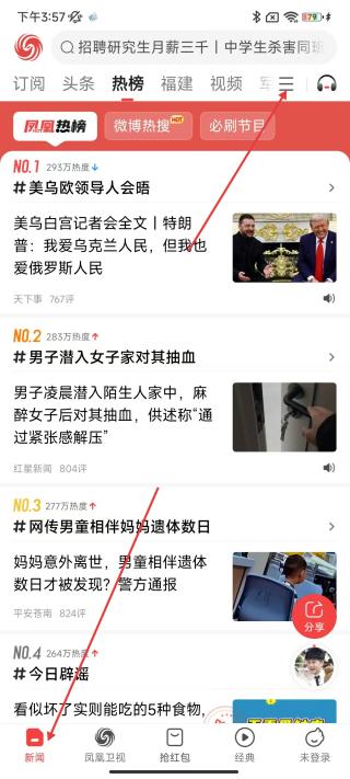 1、打開鳳凰新聞APP,在首頁底部點(diǎn)擊新聞界面進(jìn)入,點(diǎn)擊右上方三點(diǎn)目錄展開。