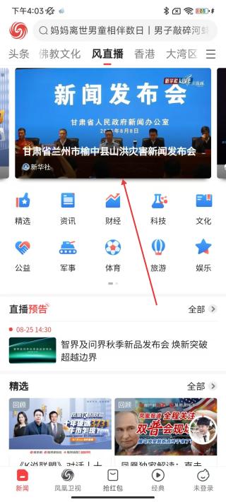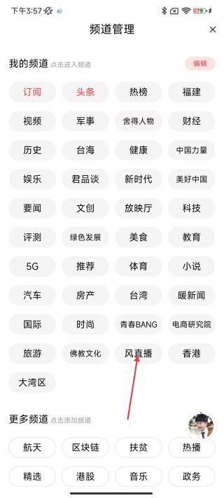 2、點(diǎn)擊進(jìn)入頻道管理頁面后,找到底下的風(fēng)直播頻道,點(diǎn)擊進(jìn)入跳轉(zhuǎn)查看新聞直播。