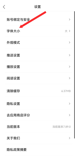3、在設(shè)置頁面中,點(diǎn)擊字體大小選項(xiàng),進(jìn)入字體大小設(shè)置頁面。
