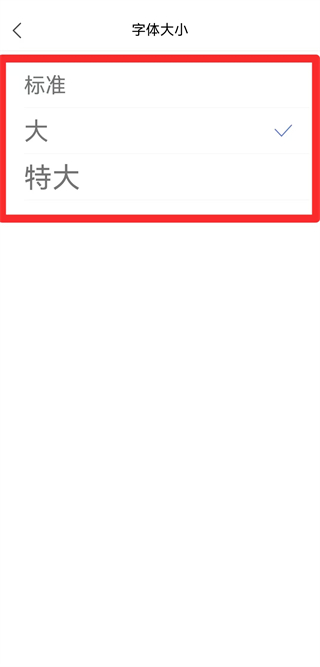4、在字體大小設(shè)置頁面,選擇標(biāo)準(zhǔn)、大或特大,即可完成設(shè)置操作。