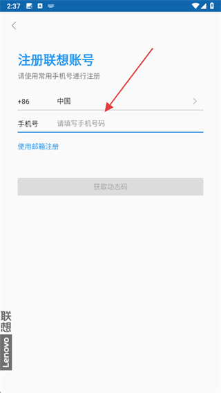 3、在注冊聯想賬號頁面,輸入手機號碼,點擊獲取動態(tài)碼。